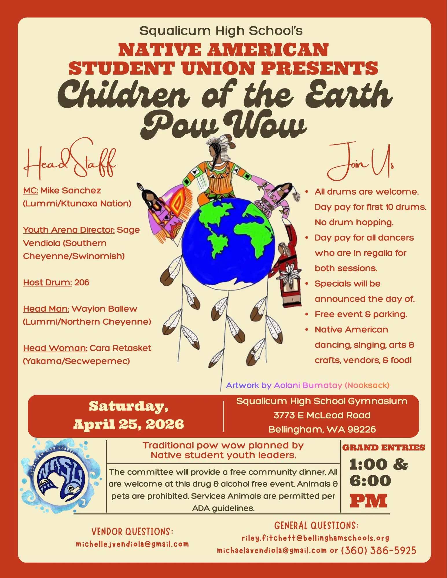Join us in supporting Squalicum High School Native American Student Union (NASU) first student-led pow wow! All are welcome to this event with a free community dinner in the SHS gymnasium. Support the students' fundraiser here.